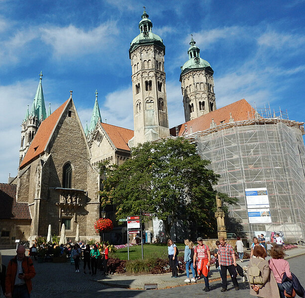 Am Morgen ging es dann, nach einem ausführlichen Frühstück, mit dem Bus nach Naumburg a. d. Saale. Bis zur Führung durch den Naumburger Dom hatten wir noch 3 Stunden Zeit zur freien Verfügung. Ein Teil besuchte den gerade stattfindenden Flohmarkt, ein anderer machte sich auf die Stadt zu erkunden. Hier kam uns das Stadtführerwissen von Sw. Andrea Zieger aus Fürth zugute. Sie suchte sich einen Rundweg durch Naumburg auf ihrem Handy und erklärte uns die Sehenswürdigkeiten der Stadt. Unser Weg führte uns über die ehemalige Stadtmauer (heute ein Fußweg) und auch zum altem Stiftsfriedhof, der wieder benutzt werden soll.