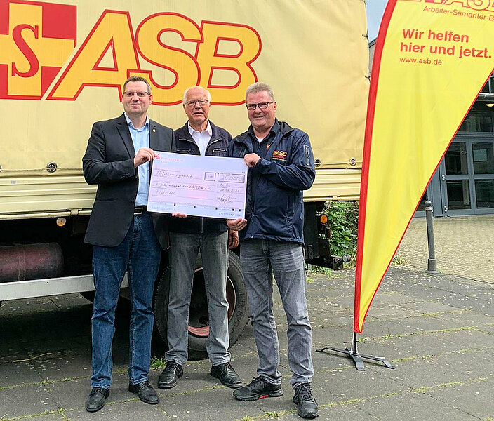 Unter der Überschrift "Hilfe für die Helfer" übergab Andreas Lüers als Vertreter der Deutschen Odd Fellows am 28. August 2021 eine Spende in Höhe von 25.000 EUR an den ASB RV Rhein-Erft/Düren e.V.
