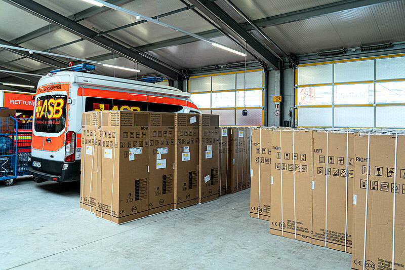 Der Regionalverband des Arbeiter-Samariter-Bunds Deutschland betreibt am Standort in Erftstadt verschiedene soziale Einrichtungen sowie eine Abteilung für die Katastrophenhilfe. Erftstadt liegt direkt im Hochwassergebiet, nahe der "Abbruchkante" im Ort Blessem, wo ganze Häuser weggespült wurden. Die hauptamtlichen und ehrenamtlichen Mitarbeiter des ASB haben in den vergangenen Wochen rund um die Uhr gearbeitet, um Menschen zu retten und Hilfsgüter zu verteilen. Die neue Fahrzeughalle musste spontan und notdürftig zu einem Lager für Hilfsgüter umfunktioniert werden. Bis heute kommen fast täglich große LKWs mit Hilfsgütern (Trocknungsgeräte, Stromgeneratoren, Hochdruckreiniger, Waschmaschinen, Kühlschränke etc.) an, die mehr oder weniger per Hand von den Mitarbeitern entladen werden müssen.