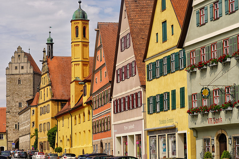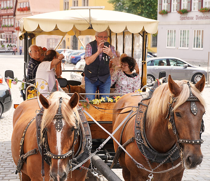 In Dinkelsbühl mussten wir zunächst der Wache hinter dem Tor Rede und Antwort zu stehen. Wir wurden als friedlich eingestuft und durften nach einem Begrüßungstrunk passieren. Die mittelalterliche Stadt hat uns alle sehr beindruckt. Nach einem kurzen Spaziergang durch die Gassen warteten drei Pferdekutschen auf uns. Der Kutscher erklärte uns sehr eindrucksvoll die Geschichte der Stadt.