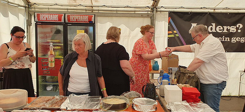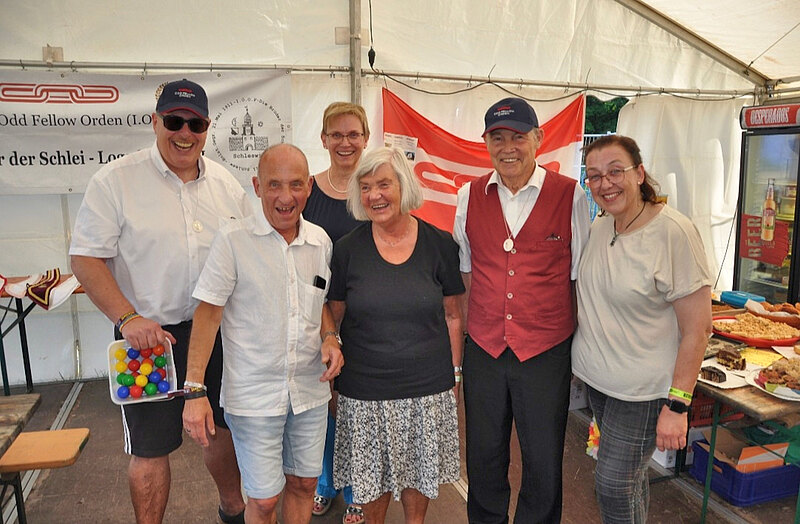 Angesprochen über Nachbarschaft, ob man nicht beim Open Air mithelfen wolle, entstand sehr schnell die Idee seitens der Rebekkas im "we support Zelt" die Kaffee- und Kuchenausgabe zu regeln und den Erlös einer gemeinnützigen Einrichtung zu spenden. Schwester Annette Behring, Obermeister Wienke Löffler sowie die Schwestern Birte Neuhoff, Eva Staerk, Ulrike Bade, Betty Schiermeyer und Christina Buchhall zeigten sich dabei besonders engagiert und waren zwei volle Tage mit der Ausgabe, dem Nachliefern und Kassieren beschäftigt.