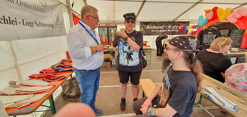 Die Brüder der Schlei beteiligten sich zwar auch mit einigen Kuchenspenden, ihr Schwerpunkt war aber ein Ratespiel aufzubauen, um den Orden mal in einer größeren Runde bekannter zu machen. Flugs wurden doppelt vorhandene Regalien frisch zurecht gelegt, ein Schneidertorso mit weißem Hemd und kettengliedrigem Kragen überzogen sowie in 24 Plastikkugeln Funktionen auf einem Stück Papier beschrieben. Wer wollte, konnte sich 3 bis 5 Kugeln auslosen und musste dann - je nachdem was in der Kugel geschrieben stand - die Funktion des Rechnungsführerers, oder Untermeisters usw - der Regalie zuordnen und dem Torso über legen. "So kamen wir gut ins Gespräch', so Obermeister Helmut Hasse, der beeindruckt davon war, welche Menschen sich hinter ihren "Kutten" verbargen und nicht selten Banker, Bauunternehmer, Pfleger oder Lehrer waren. Bruder Dr. Arthur Christiansen, der für die Regalienaufbereitung zuständig war und die Brüder Ingo Gschwendtner sowie Jörg Friedrichsen, die logistisch "vor und hinter der Bühne" ständig präsent waren, machten den Backoffice während Großmeister Roland Krumpholz an der Staffelei die Aufteilung der Halle mit den Stühlen erklärte. Selbstredend hatten die Schwestern und Brüder ihre Fleyer mit, von denen auch einige raus gingen.