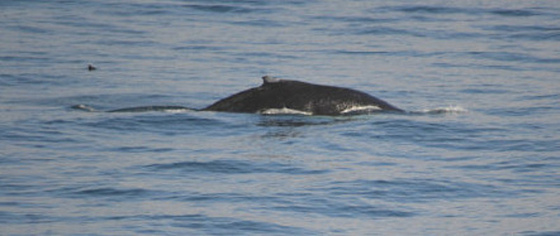 Es kam ein zweites Schiff, und beide Schiffe versuchten, dem Wal den Fluchtweg abzuschneiden. Dann kam ein drittes Schiff und bildete zusammen mit den beiden ersten ein Dreieck, in dessen Mitte der Wal vermutet wurde. Das Tier erkannte seine prekäre Lage und verschaffte sich mit einem hohen Luftsprung einen Überblick. Dieser Augenblick war das Highlight. Ein Raunen ging übers ganze Schiff. Der Wal war für eine Sekunde fast zur Gänze über dem Wasser - aber nur von einer Schiffsseite aus zu sehen, Pech, wer auf der falschen stand. Smartphones, Pockets, Spiegelreflex, überall klackte und schnurrte es, und doch waren die meisten zu langsam und fotografierten nur noch die Spritzer vom Abtauchen. Danach trickste der Wal die Schiffe aus und entkam, indem er unter ihnen wegtauchte. Der Versuch, ihn noch einmal einzuholen, scheiterte an seiner Schlauheit, im Zickzack davonzuschwimmen. Schließlich gaben die Schiffe auf. Fast eine Stunde dauerte die Rückfahrt.