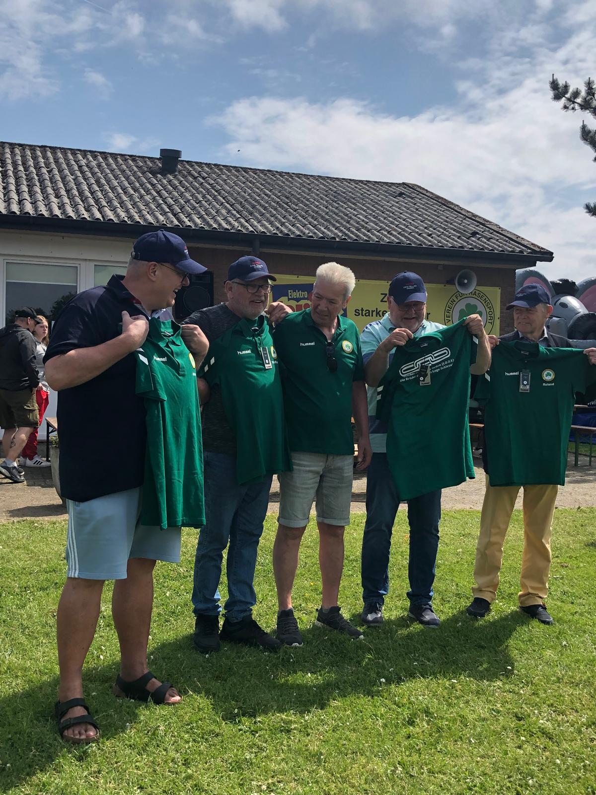 Sommerpause Das Foto zeigt das Geschenk von 4 Trikos des VFR Schleswig jedes mit den Namen versehen an die Brüder von links nach rechts :Artur Christiansen,Wolfhard Schulz, 1. Vorsitzender des VFR Schleswig Klaus Lenkewitz, Helmut Hasse, Roland Krumpholz